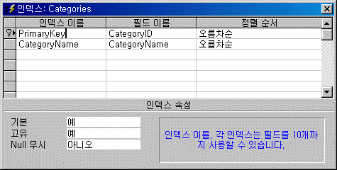 À妽ºÀÇ ¼Ó¼º ¼³Á¤ : À妽ºÀÇ À̸§, À妽º¿¡ Æ÷ÇÔµÈ ÇʵåÀ̸§, Á¤·Ä¼ø¼, ±âº» Ű ¼³Á¤, °íÀ¯ Ű ¼³Á¤, Null°ª ¹«½Ã µîÀ» ¼³Á¤ÇÒ ¼ö ÀÖ½À´Ï´Ù. À妽º¿¡ ´ëÇØ¼´Â µÚ¿¡¼ ¼³¸íÇÕ´Ï´Ù.