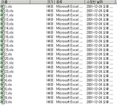 °¡·É 1.xls, 2.xls, 3.xls, 4.xls, 5.xls, 6.xls, 7.xls, 8.xls, 9.xls, 10.xls, 11.xls, 12.xls, 13.xls, 14.xls, 15.xls, 16.xls, 17.xls, 18.xls, 19.xls, 20.xls, 21.xls, 22.xls µîµîÀÇ ÆÄÀÏÀÌ ÀÖ´Â °æ¿ì À̸§¼ø¼·Î Á¤·ÄÇϸé 1.xls, 10.xls, 11.xls, 12.xls, 13.xls, 14.xls, 15.xls, 16.xls, 17.xls, 18.xls, 19.xls, 2.xls, 20.xls, 21.xls, 22.xls, 3.xls, 4.xls, 5.xls, 6.xls, 7.xls, 8.xls, 9.xls ¼ø¼´ë·Î µË´Ï´Ù.