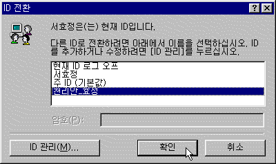 2. [ID Àüȯ] ´ëÈ »óÀÚ°¡ ³ªÅ¸³ª¸é ÀüȯÇÏ°í ½ÍÀº ID¸¦ ¼±ÅÃÇÑ ´ÙÀ½ [È®ÀÎ] ´ÜÃ߸¦ Ŭ¸¯ÇÕ´Ï´Ù. ¸¸ÀÏ ¼±ÅÃÇÑ ID°¡ ´Ù¸¥ °èÁ¤À¸·Î ¿¬°áÀ» ¿ä±¸ÇÑ´Ù¸é ¿¬°áÀ» ÀüÈÇϱ⸦ ¿øÇÏ´ÂÁö ¹¯´Â ¸Þ½ÃÁö°¡ ³ªÅ¸³³´Ï´Ù. °è¼ÓÁøÇàÇϱâ À§ÇØ [¿¹]¸¦ Ŭ¸¯ÇÕ´Ï´Ù.