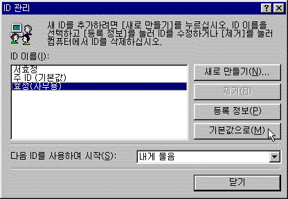 4. ´ÙÀ½ ID¸¦ »ç¿ëÇÏ¿© ½ÃÀÛ'Ç׸ñ¿¡¼ ÇÁ·Î±×·¥ÀÌ ½ÃÀÛÇÒ ¶§ »ç¿ëÇÒ ID¸¦ ¼±ÅÃÇÕ´Ï´Ù. ±âº» ¼³Á¤Àº [³»°Ô ¹°À½]À» »ç¿ëÇϴµ¥, ÀÌ ¼³Á¤Àº ÇÁ·Î±×·¥ÀÌ ½ÃÀÛÇÒ ¶§ ¿©·¯ºÐÀÌ ID¸¦ Á÷Á¢ ¼±ÅÃÇÒ ¼ö ÀÖÀ¸¸ç, ½ºÅ©·Ñ¹Ù¸¦ ÀÌ¿ëÇÏ¿© ¸¸µé¾îÁø ´Ù¸¥ ID¸¦ ¼±ÅÃÇÒ ¼ö ÀÖ½À´Ï´Ù.