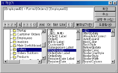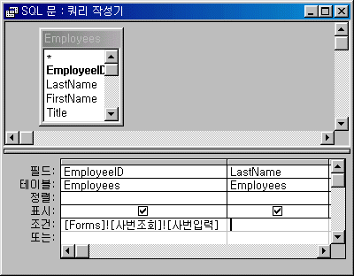 21. EmployeeID ÇʵåÀÇ Á¶°Ç¿¡ Ŭ¸¯ÇÑ ÈÄ [Forms]![»ç¹øÁ¶È¸]![»ç¹øÀÔ·Â]¸¦ ÀÔ·ÂÇÑ´Ù.