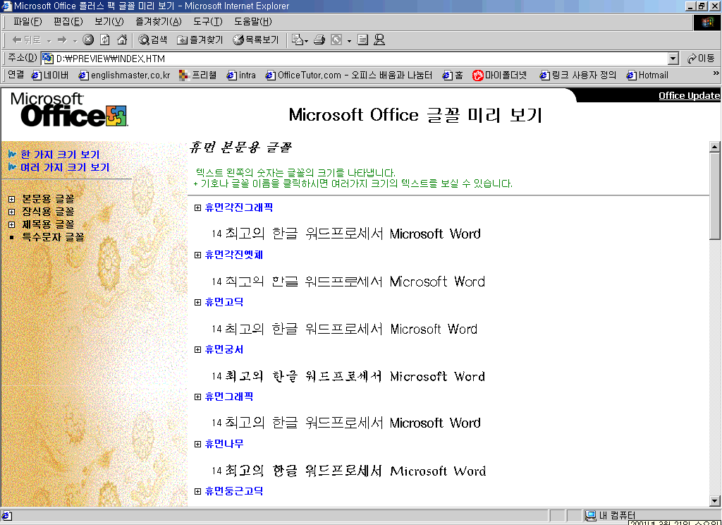 Microsoft Office XP¿Í ÇÔ²² Ãß°¡ÀûÀ¸·Î Á¦°øµÇ´Â ÇÁ·Î±×·¥À¸·Î ´Ù¾çÇÑ Á¾·ùÀÇ ÇÑ±Û ±Û²Ã, °¢Á¾ ¾÷¹« ¹× °³ÀÎ¿ë ¾ç½ÄÀÇ ¼½Ä