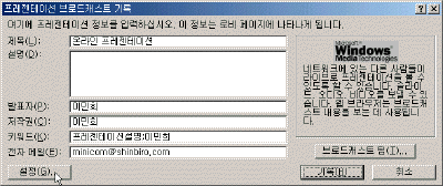 ¨è ÇÁ·¹Á¨Å×À̼ÇÀÇ Á¦¸ñ°ú ¹ßÇ¥ÀÚ, ÀüÀÚ ¸ÞÀÏ µîÀ» ÀÔ·ÂÇÑ´Ù. ºê·Îµåij½ºÆ®´Â ³×Æ®¿öÅ© ȯ°æ¾ÈÀÇ Æú´õ¿¡¸¸ ÀúÀåÇÒ ¼ö ÀÖ´Ù. ¼³Á¤