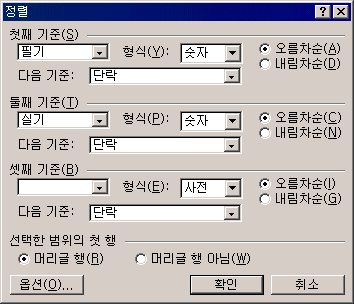 ±âÁØÀ» µÎ¾î Á¤·ÄÇÒ °æ¿ì¿¡´Â ¿ì¼± ¼øÀ§¿¡ µû¶ó ù°, µÑ°, ¼Â° ±âÁØÀ» ¼³Á¤ÇÑ´Ù. °¢ ±âÁØ¿¡ µû¶ó Á¤·Ä Çü½Ä(¼ýÀÚ, »çÀü, ³¯Â¥,