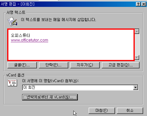 vCard¶õ »ç¿ëÀÚÀÇ ÁÖ¼Ò³ª ¿¬¶ôó°¡ ÀÖ´Â ÀüÀÚ¸íÇÔÀ» ÀǹÌÇÕ´Ï´Ù. »ó´ë¹æ¿¡°Ô ¸ÞÀÏÀ» º¸³¾ ¶§ ¸ÎÀ½¸»·Î Æ÷ÇÔ½Ã۸é, ¼ö½ÅÀÚ°¡ Á¤º¸¸¦ ÀÐ°í ¸¶¿ì½º¸¦ Ŭ¸¯ÇÏ¿© vCard¸¦ ÁÖ¼Ò·Ï¿¡ Ãß°¡ÇÒ ¼ö ÀÖ½À´Ï´Ù. |