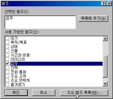¹üÁÖ·Î ¹Àº ´ÙÀ½¿¡´Â ¹üÁÖº°·Î Ȱµ¿À» ±¸¼ºÇϰųª º¼ ¼ö ÀÖ½À´Ï´Ù. ¿¹¸¦ µé¾î ÆÀ ÀÛ¾÷¿¡ ´ëÇÑ ¾à¼ÓµéÀ» ÇϳªÀÇ ¹üÁÖ¿¡ ³Ö°í, ³ªÁß¿¡ ÀÌ ÀÛ¾÷¿¡ ´ëÇÑ È°µ¿ ³»¿ªÀ» º¼ Çʿ䰡 ÀÖÀ» ¶§ ±× ¹üÁÖ¿¡ ÁöÁ¤µÈ ¸ðµç ¾à¼Óµé¸¸ º¼ ¼ö ÀÖ½À´Ï´Ù. ÇϳªÀÇ ¾Æ¿ô·è Ç׸ñ¿¡ ¿©·¯ °³ÀÇ ¹üÁÖ¸¦ ÁöÁ¤ÇÒ ¼öµµ ÀÖ½À´Ï´Ù.