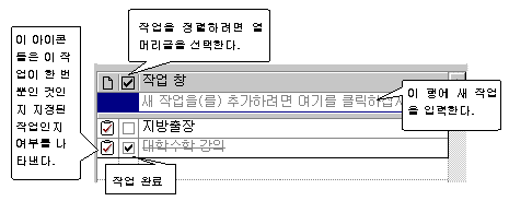 ÀÛ¾÷ â¿¡¼ '»õ ÀÛ¾÷À»(¸¦) Ãß°¡ÇÏ·Á¸é ¿©±â¸¦ Ŭ¸¯ÇϽʽÿÀ.'¸¦ Ŭ¸¯Çϰí ÀÛ¾÷ À̸§À» ÀÔ·ÂÇϰí [Enter]¸¦ ´©¸¥´Ù. ÀÛ¾÷â¿¡¼´Â ÀÛ¾÷ÀÇ ¿ä¾àÀ» º¼ ¼ö ÀÖ´Ù. ÀϹÝÀûÀ¸·Î ÀÛ¾÷ âÀº Á¾·áÀÏÀÌ Á¤ÇØÁ® ÀÖ´Â ÀÛ¾÷(»¡°£»öÀ¸·Î Ç¥½ÃµÈ´Ù) »Ó¸¸ ¾Æ´Ï¶ó Á¾·áÀÏÀÌ Á¤ÇØÁöÁö ¾ÊÀº ÀÛ¾÷À» Æ÷ÇÔÇÏ¿© ÇöÀç ÁøÇà ÁßÀÎ ÀÛ¾÷À» º¸¿©ÁØ´Ù. ¿Ï·á»óÀÚ¸¦(µÎ¹øÂ° ¿¿¡ ÀÖ´Â È®Àζõ) Ŭ¸¯Çϸé OutlookÀÌ ÇØ´çÀÛ¾÷¿¡ ¼±À» ±ß´Â´Ù.
